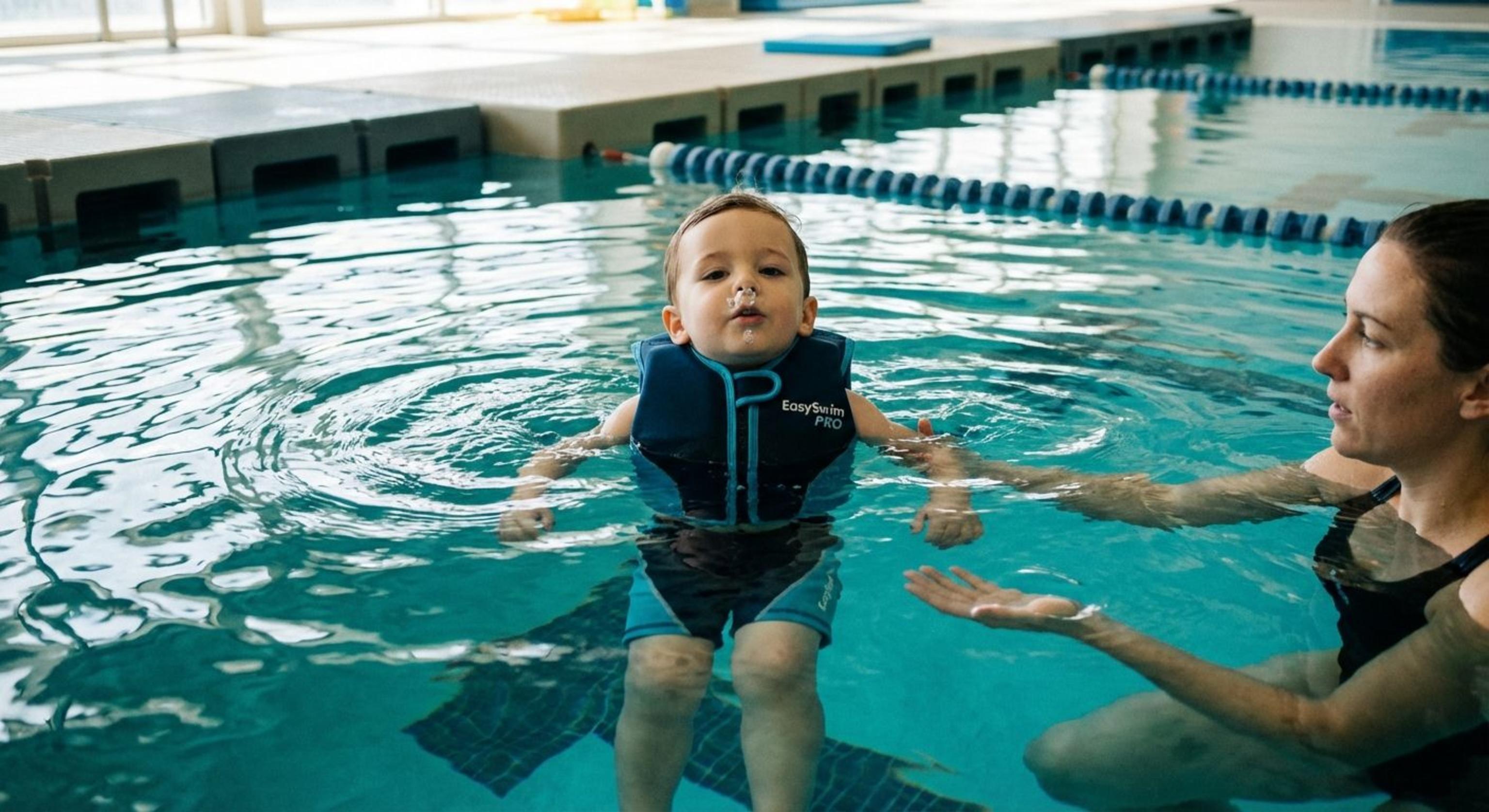 Säkerhet är alltid vårt löfte, särskilt när vi bjuder in barn till djupt vatten. Våra lektioner använder en flytdräkt som är speciellt utformad för att stödja lärande utan att begränsa rörelsen. Till skillnad från en flytväst tillåter denna dräkt fria arm- och benrörelser så att barnen kan vrida sig, sträcka sig och glida. Det mjuka stödet gör det omöjligt att sjunka men låter barnet själv göra upptäckterna. De lär sig snabbt hur vattnet bär deras kropp, vilket gör att de kan slappna av och lita på sina egna förmågor. Föräldrar ser leenden när tvekan försvinner och verkligt självförtroende växer.
